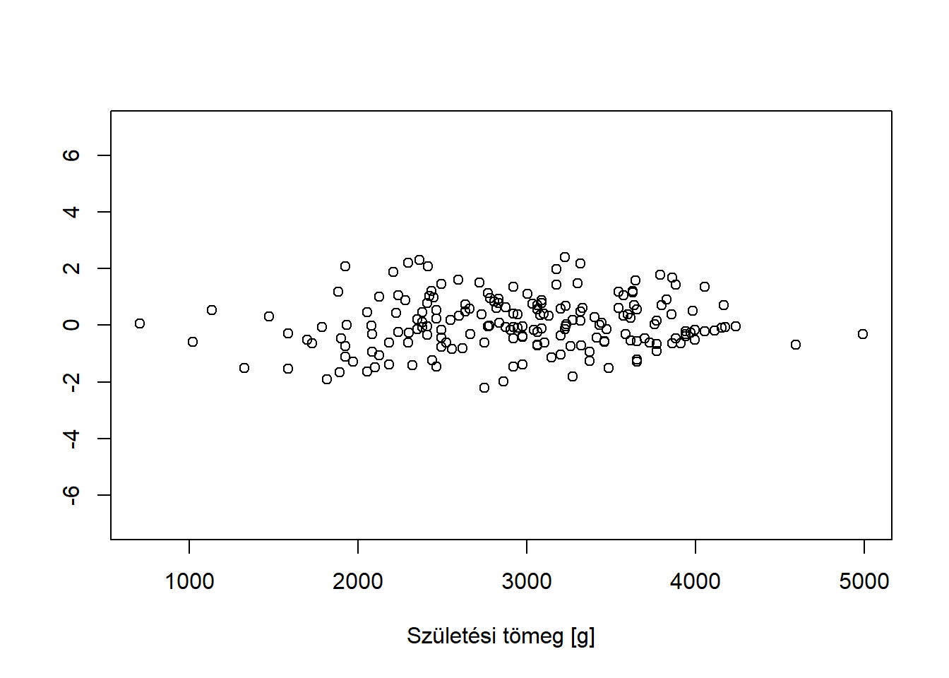 A születési tömegek korrigált mintaszórása 729.2142952 gramm, tehát az újszülöttek testtömegeinek átlaguk körül vett ingadozásának átlaga 729.2142952 gramm.